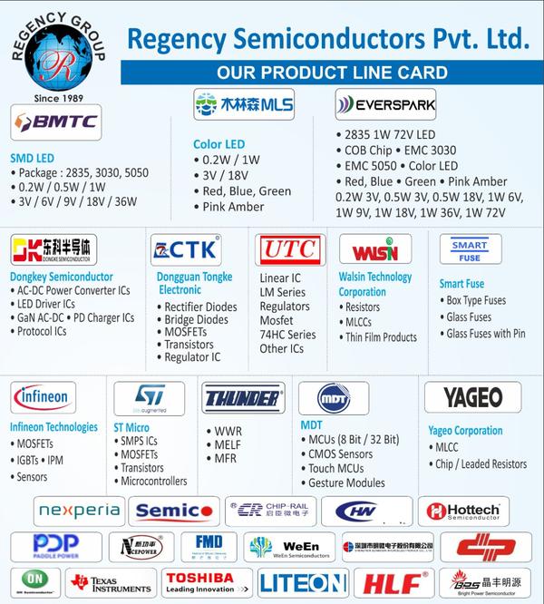 Established in the year 1998, we, “Regency Semiconductors Pvt. Ltd.”, are counted amongst the eminent suppliers, wholesalers, distributors, traders and importers of a wide range of Electronic Products. Our product range includes Electronic Components, Integrated Circuits and Electronic Transistors. All our products are in compliance with international quality standards. These products are procured from trusted vendors of the market, who ensure 100% quality. Our products are highly demanded by our clients due to its varied features such as high performance, durability and long service life. Supported by dexterous team of professionals, we have been able to gain recognition in the market. They work in close collaboration with each other to maintain the highest quality standards of our products. The quality of our products are thoroughly tested by our experienced quality analysts on various parameters before supplying it to the customers. Moreover, our vendors use A-grade raw material to manufacture our products. Owing to all these factors, we have been able to gather huge clients across Indian Subcontinent. We import our products from across the globe. Furthermore, we have a capacious warehouse which enables us to store bulk stocks of products and cater to large demands of clients spontaneously. It is properly managed by experts, and equipped with all the requisite tools & equipments for protection against fire or theft. We also ensure proper packaging of the electrical products as it is an important aspect in ensuring their safe delivery. Under the authority of our mentor Mr. Sanjay Mehta, we have figured out how to achieve a few statures of accomplishment, in the previous years, owing to his capacity to comprehend the business sector, break down the progressions and settle on excellent managerial choices. Integrated Circuits OB2269CCPA - ON BRIGHT IC LM358DT HEF4011BT HEF4013BT HEF4017BT HEF4050BT HEF4081BT HEF4093BT LM324DR SMD IC LNK6666E Power Integrations L293D Integrated Circuit BP9021A IC Driver Chip Interface IC MAX232CSE LM339DR2G Electronic Component TOP245YN Transistors LM324DT SMD Integrated Circuit NE5532P Timer IC 6N136 Integrated Circuits AT24C02N-10SI Microcontroller BTA16-600B Triacs Electronic Integrated Circuits HEF4016BP IC Integrated Circuits IC MAX485CSA Interface MAX485CPE Integrated Circuit MAX705CPA Integrated Circuit MT8816 Integrated Circuits M27C512-12 Integrated Circuit MAX232CPE Integrated Circuit MM74HCT373WMX Electronic Component NE555N Timer IC SN75176 IC Differential Bus Transceiver CS7107GN IC Integrated Circuits DS12C887 Timer IC DS1232 IC Chip ULN2803AFW Electronic Component ULN2003ADR Electronic Component CW34063CP DC/DC Converter XR2206CP Integrated Circuits DS1307Z Integrated Circuits SMD LED Bridgelux SMD LED 2835 0.2W - 26-28 Lumens Bridgelux SMD LED 2835 1W 9V 3030 LED 1 W 2835 SMD LED 1 W 5730 SMD LED 60-65lm Warm White SMD LED 3030 1206 Light Emitting Diode SMD LED Blue 2835 2W 2835 SMD LED 26-28LM 5630 SMD LED 0603 SMD LED 2835 LED 60-65lm 3535 Samsung SMD LED 0805 SMD MLCC Power Ceramic Capacitor SMD LED 3030 Warm White SMD LED 1206 3030 1W SMD LED SMD LED Red 2835 0.2W 2835 Samsung 1W SMD LED SMD LED Green 2835 2 W 2835 Samsung SMD LED 5050 SMD LED LED Driver IC D8077B LED Driver IC BP2326A LED Driver IC BP3122 LED Driver IC BP3319MB LED Driver IC BP9022A LED Driver IC BP3318 LED Driver IC BP3316D LED Driver IC BP3126 LED Driver IC BP3518H LED Driver IC BP2327A LED Driver IC BP2329A LED Driver IC BP3315 LED Driver IC BP3125 LED Driver IC BP2328D LED Driver ICS BP2328AJ LED Driver IC BP2833D LED Driver IC BP2832A LED Driver IC BP1808 LED Driver IC BP1361 LED Driver IC BP2831A LED Driver IC BP3133A LED Driver IC BP2338 LED Driver IC Bp 1601 LED Driver IC BP3516C LED Driver IC BP2833d PCB Non Isolated LPF LED Driver IC BP2327A PCB Non Isolated LED Driver IC UniOhm Chip Resistors 0603 1%-(0R, 10R - 1M) Uniohm SMD Resistors 1206 5% Uni Ohm Chip Resistor 0402 5% SMD Resistor 0603 1%-(1R - 9.76 R , 1.02M - 10 M) SMD Resistance 0805 5% Uniohm SMD Resistors UniOhm Resistors UniOhm Chip Resistor 0805 1% - (1R - 9.76 R , 1.02M - 10 M) SMD Resistor Royal Ohm SMD Resistors Royalohm SMD Resistor 1206 1% (0R, 10R - 1M) SMD Resistors Yageo Chip Capacitors Yageo Chip Capacitor SMD Capacitors Yageo SMD Capacitor Walsin SMD Resistors Royalohm SMD Resistor 0603 5% Diodes and Rectifiers Diode LL4148ST MB10S Diodes GBU810 Bridge Rectifiers DB107 AND DB107S Bridge Rectifiers 20SQ045 Schottky Barrier Rectifier KBL10 6a10 Diode KBP210 Bridge Rectifier 1N4007 Diodes 15SQO45 Diodes MB6S Diodes ES1J Diodes IN5819 Diode Rectifier M7 Diode Fast Recovery Diode Ultra Fast Rectifier and Diode 1N5408 Diode Schottky Diode GBU410 Bridge Rectifiers 10A10 Diode Diode and Rectifier Smd Silicon Rectifier and Diode US1M Diodes SS14 Schottky Barrier Rectifier Silicon Rectifier & Diode Automotive Rectifier Diode Rectifer Diodes MB8S Diodes Sinterglass Diode BYV26E BYV28-200 Diode RS1M Diode Power Resistor DF10M Bridge Rectifier SS24 Power Rectifier MUR120RL MB10F Bridge Rectifier MUR420RL Rectifiers MUR460RL Rectifier Metallized Capacitor UC3842BN Integrated Circuits Mosfets ITA07N65R Mosfets 7N65 MOSFETs IRFZ44NPBF Mosfet Transistor TK10A80E ITA06N80R Mosfet ITA10N65R Mosfet ITA12N65R Mosfet Cdt10n80 Mosfet TK6A80E MOSFETS TK10A80 MOSFET Tk5a65d Mosfets CDT8N80 MOSFETs IPS04N60B MOSFETs K7A60W Toshiba Transistors 9n90 Mosfets CDT6N60 MOSFETs 21N60 Mosfet OP07CDR Mosfets Power Mosfet Transistor IRF730 Integrated Circuits ISA08n80A Mosfets ISA10N80A. MOSFETS Dongke Semiconductor DK236 IC 36W SMPS/CCTV IC 10.000 MHz Crystal Oscillators Electronic Optocoupler 7D511 Varistor FL817B/C Optocoupler Chip Optocoupler Chip SMD LED 2835 Natural White 0805 SMD LED EL817B/C Phototransistor TPL550 Photocoupler IC Integrated Circuit AP8022 SMPS IC LM358DR LM2576R 12V HTC IC 3030 LM335AZT Integrated Circuits PN2907A Integrated Circuits UA741CP Amplifier 4N25 Integrated Circuits BC546BU Integrate